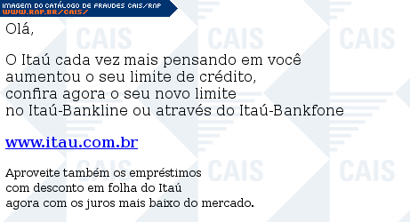 | comentário | Mensagem do Banco Itaú informando sobre um suposto aumento no limite de crédito. Não foi possível localizar o arquivo malicioso atrelado à mensagem. | |