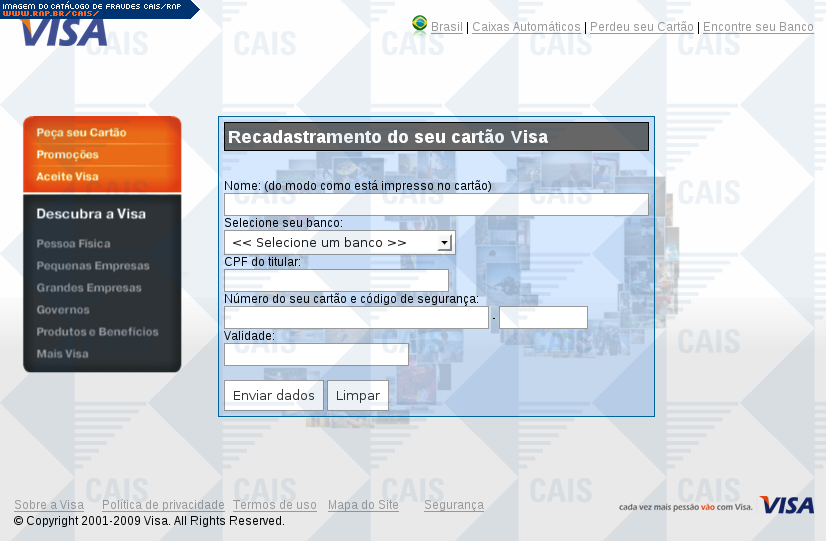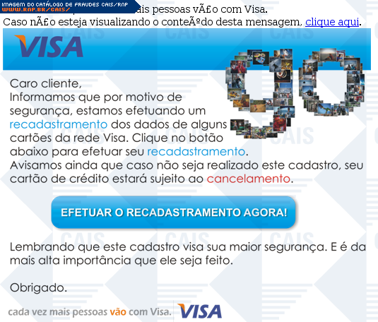 | comentário | Mensagem falsa pedindo a vítima que faça o recadastramento do seu cartão de crédito Visa. O recadastramento seria obrigatório e a não realização implicaria no cancelamento do cartão. O link para o recadastramento leva a uma página falsa com campos para inserção... (leia mais) | |