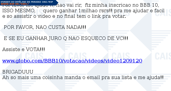 | comentário | Mensagem na qual o remetente se diz estar inscrito no processo de seleção para o BigBrotherBrasil 10. A vítima é solicitada a assitir um suposto vídeo e votar nesta pessoa. O link para o vídeo na verdade aponta para o arquivo malicioso identificado como TR/Spy.Banker.Gen.... (leia mais) | |