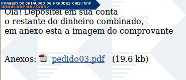 | comentário | A mensagem se passa pelo envio de um suposto comprovante de depósito. A fraude contém um link que leva a um arquivo malicioso que foi identificado como Gen:Trojan.Heur.VP.tm0@a8haw3oi (BitDefender). | |