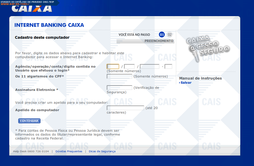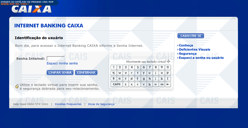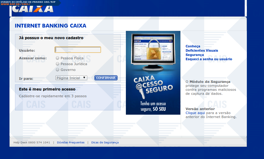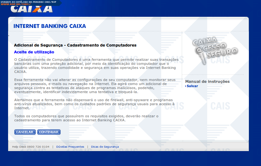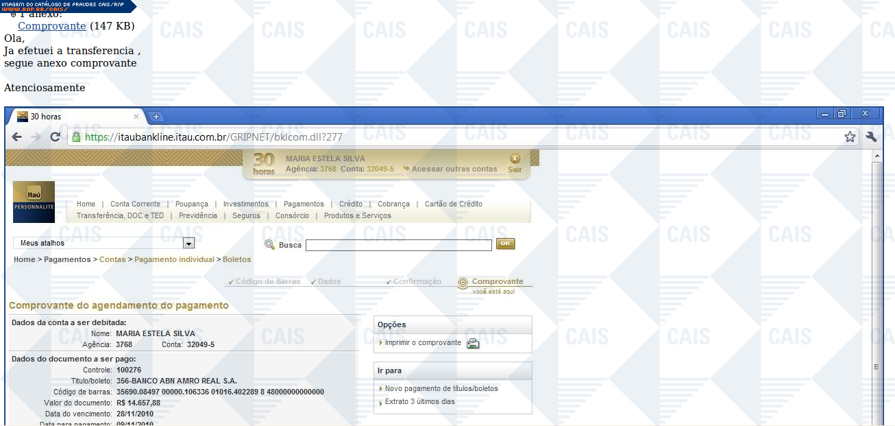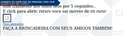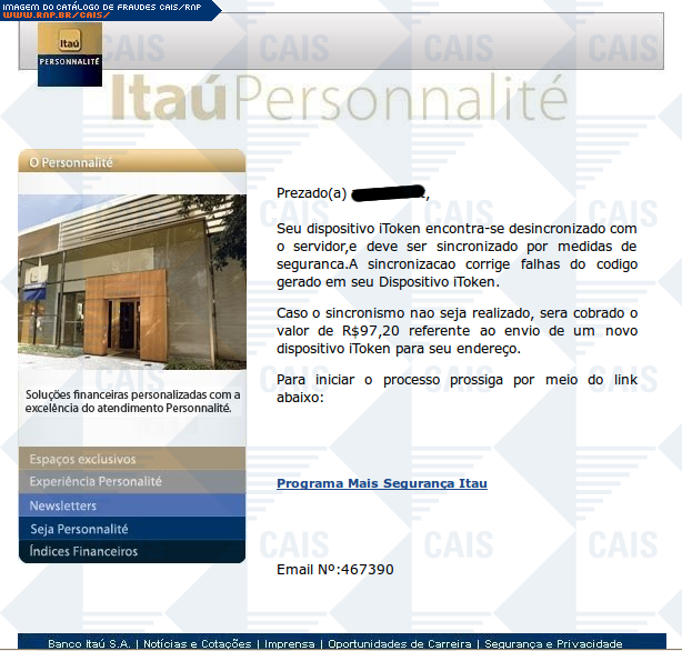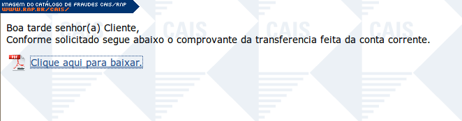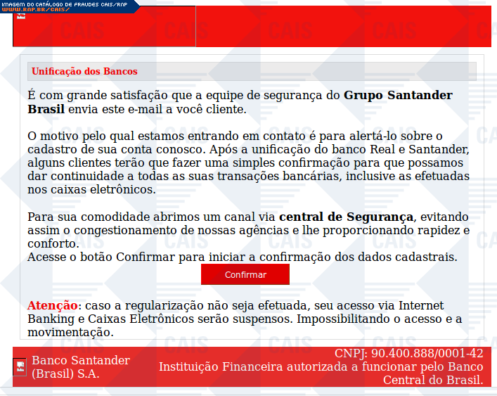 Esta página tem função informativa e educativa. Exibe uma coleção de imagens de phishing scam (fraudes eletrônicas) ou malware (código malicioso) veiculados por meio de spam (e-mail não-solicitado). Trata-se de conteúdo exemplificativo, não exaustivo, uma vez que não é possível contemplar todos os casos de fraudes existentes. Assim, caso você tenha conhecimento de um exemplar que não esteja aqui presente, isto não significa que não seja válido ou real. Inclusive incentivamos que você o envie para análise do CAIS para que, se for o caso, passe a integrar o nosso acervo.