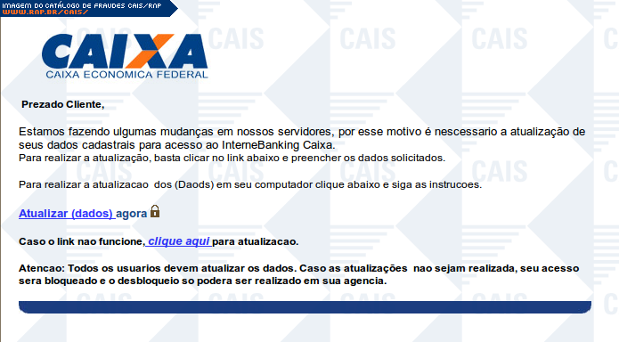 | comentário | A mensagem se passa por um comunicado falso em que a Caixa pede que a vítima realize a atualização de seus dados. O link para a suposta atualização leva a uma página falsa, destinada a roubar dados da conta bancária da vítima. | |