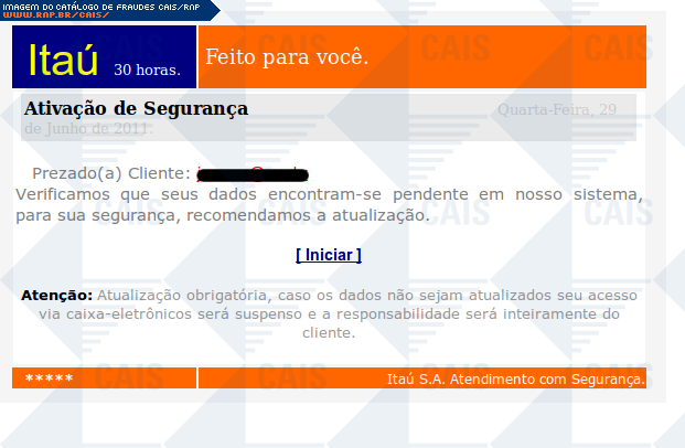 | comentário | Comunicado falso em nome do banco Itaú, que estaria solicitando que a vítima realize uma ativação de segurança. A mensagem contém um link que leva a conteúdo malicioso que não estava mais disponível no momento da análise. | |