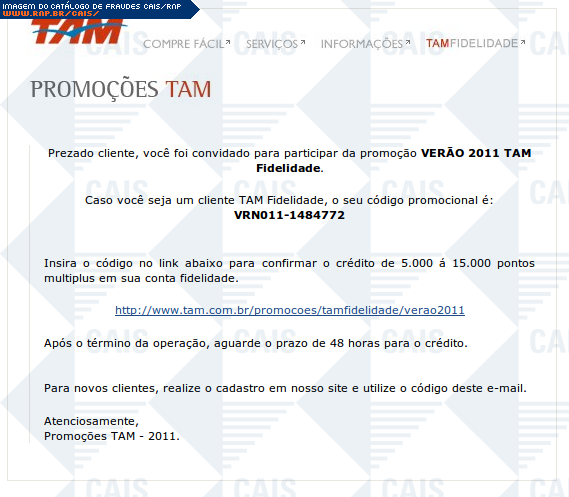 | comentário | A mensagem usa o nome da TAM para divulgar uma suposta promoção. O link para o cadastro na promoção leva a conteúdo malicioso que não estava mais disponível no momento da análise. | |