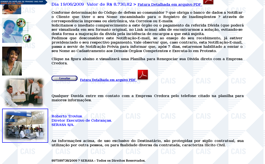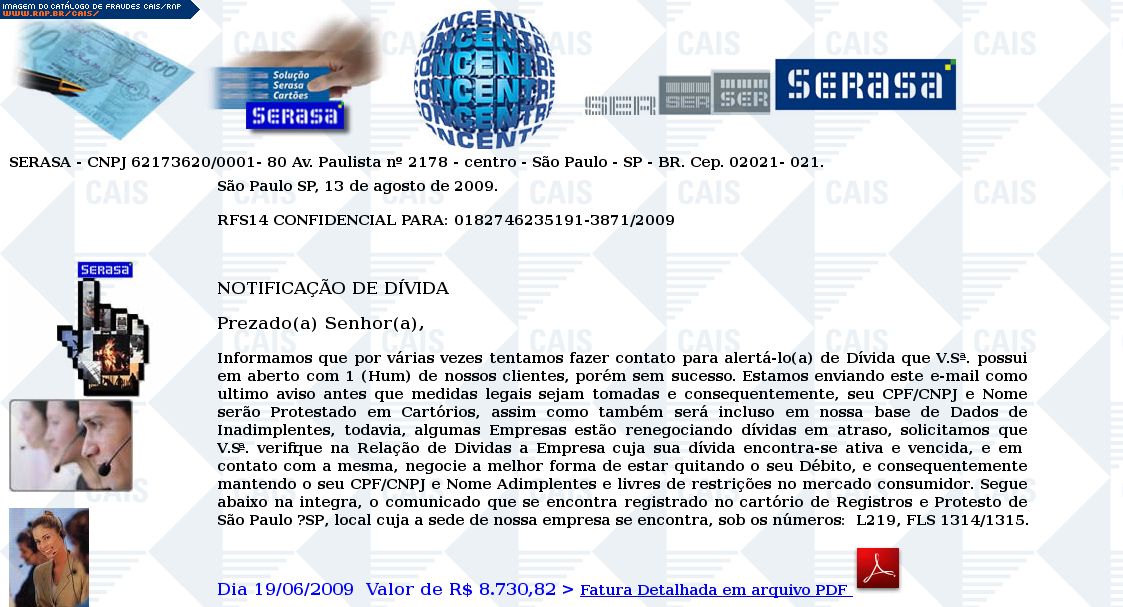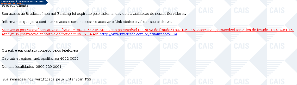 Esta página tem função informativa e educativa. Exibe uma coleção de imagens de phishing scam (fraudes eletrônicas) ou malware (código malicioso) veiculados por meio de spam (e-mail não-solicitado). Trata-se de conteúdo exemplificativo, não exaustivo, uma vez que não é possível contemplar todos os casos de fraudes existentes. Assim, caso você tenha conhecimento de um exemplar que não esteja aqui presente, isto não significa que não seja válido ou real. Inclusive incentivamos que você o envie para análise do CAIS para que, se for o caso, passe a integrar o nosso acervo.