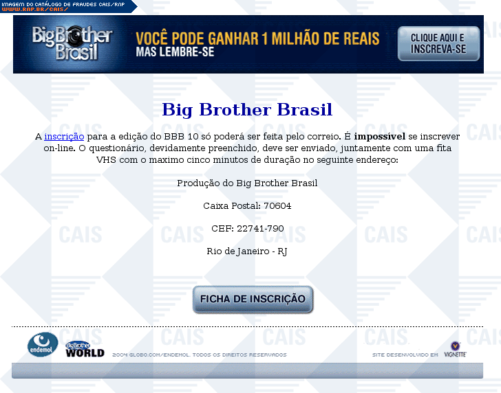 | comentário | Fraude contendo os procedimentos para a inscrição no Big Brother Brasil, Segundo a mensagem, a inscrição deverá ser feita pelo correio com o questionário preenchido e uma fita VHS. O software malicioso não foi encontrado no momento da análise. | |