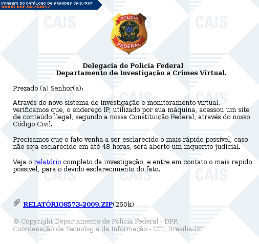 | comentário | Comunicado falso da Polícia Federal informando que o IP da vítima foi pego acessando site com conteúdo ilegal. O texto, com muitos erros de português, diz que um inquérito judicial será aberto se o fato não for esclarecido em 48 horas. A mensagem fornece... (leia mais) | |