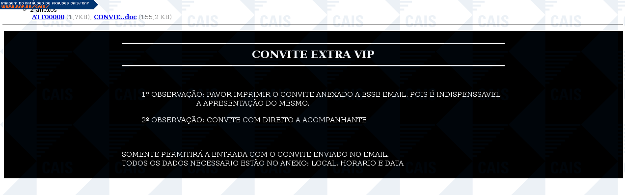 | comentário | Fraude com convite Extra VIP, com direito a acompanhante, para uma festa. Dois links que se passam por anexos do email conteriam os detalhes como local, horário e data da festa. Os links direcionam a vítima para conteúdo malicioso, não disponível no momento... (leia mais) | |
