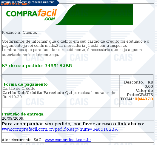 | comentário | Mensagem se passando pelo comprafacil.com informando que o débito no cartão de crédito da vítima foi efetuado e que a mercadoria já está em transporte. O texto fornece somente o valor da compra (R$ 440,30), sem qualquer detalhe a respeito da mercadoria em... (leia mais) | |