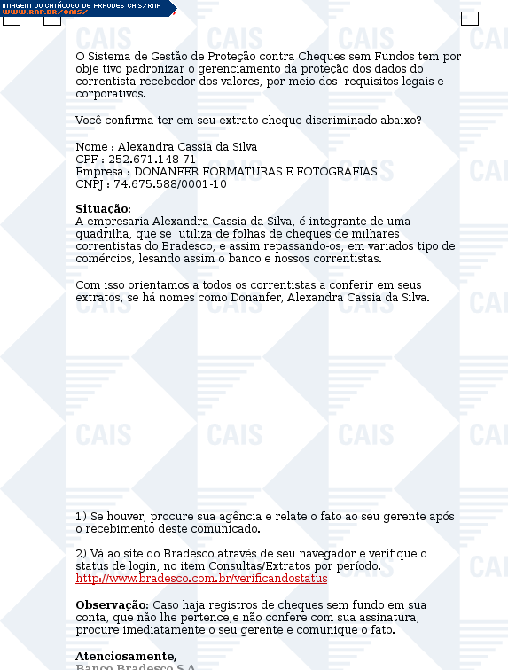 | comentário | Mensagem se passando pelo Banco Bradesco comunicando golpe aplicado por golpista de nome Alexandra Cassia da Silva, que, aparentemente, passaria cheques sem fundos em nome de clientes do banco. O texto instrui a vítima a conferir em seu extrato bancário se... (leia mais) | |