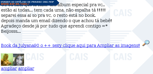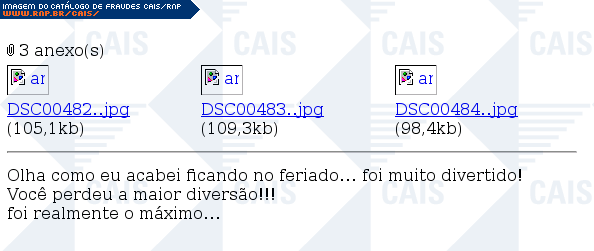 | comentário | Mensagem de suposta conhecida enviando fotos ítimas que teriam sido feitas "especialmente" para a vítima. A fraude contém duas fotos sensuais em tamanho muito reduzido. Ao clicar na opção de ampliar a imagem a vítima é direcionada para um software malicioso... (leia mais) | |