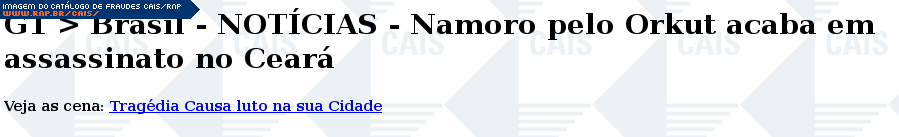 | comentário | Mensagem com uma manchete do portal G1 da globo.com informando sobre um namoro que teria começado pelo Orkut e acabado em tragédia. A fraude traz um link que levaria a um vídeo do ocorrido. Ao clicar no link a vítima é direcionada para uma página que alerta... (leia mais) | |