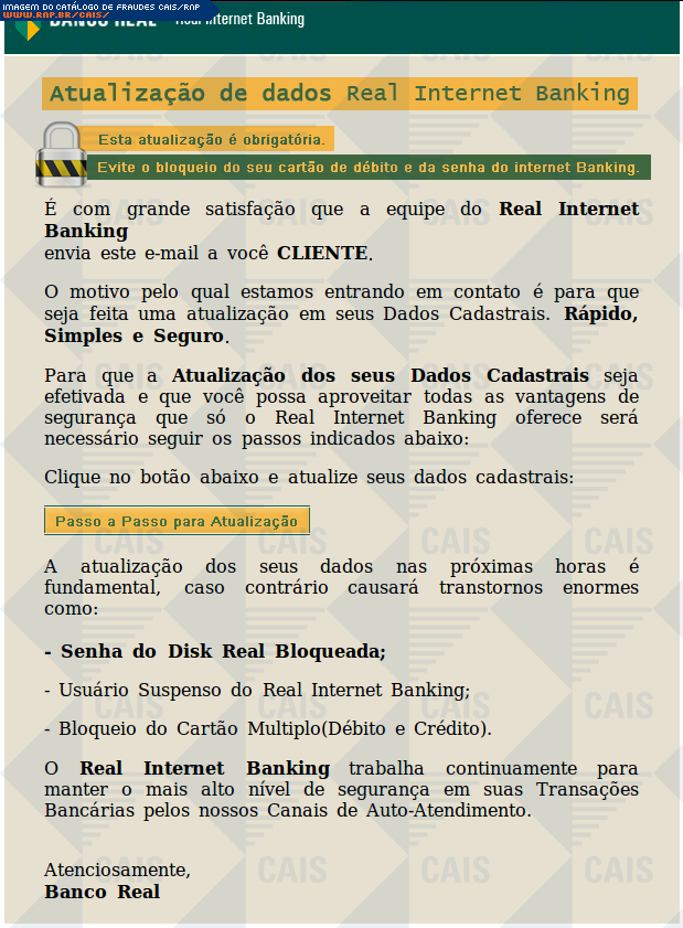 | comentário | Email falso do banco Real que informa ao destinário que será necessário que o mesmo faça uma atualização de seus dados cadastrais junto ao banco, e para tal o usuário deveria proceder com uma atualização, que é um link para um arquivo executável. Note que... (leia mais) | |