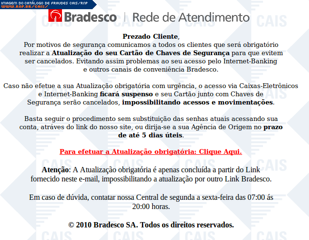 | comentário | Falso email do Banco Bradesco que solicita ao destinatário que seja recadastrado o seu cartão de segurança. Note que o Bradesco não tem como política recadastrar cartões de segurança, ainda mais pela internet. O site que o email solicita que a pessoa faça... (leia mais) | |