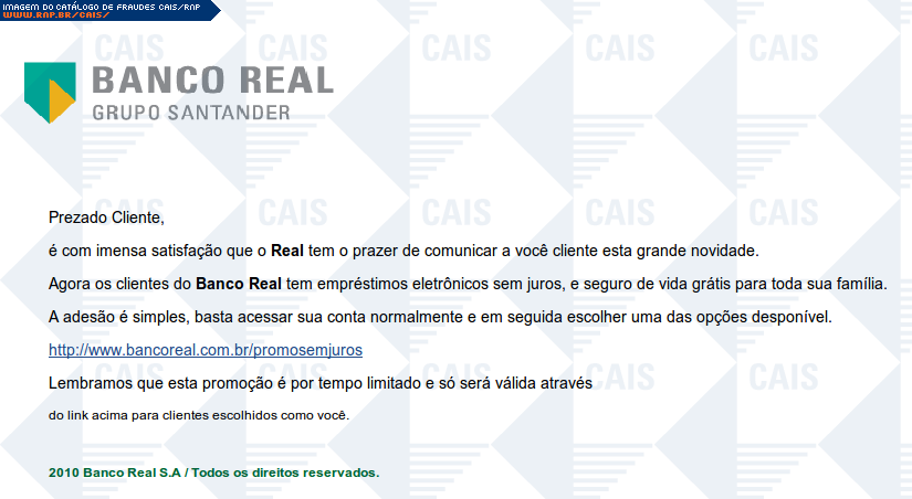 Esta página tem função informativa e educativa. Exibe uma coleção de imagens de phishing scam (fraudes eletrônicas) ou malware (código malicioso) veiculados por meio de spam (e-mail não-solicitado). Trata-se de conteúdo exemplificativo, não exaustivo, uma vez que não é possível contemplar todos os casos de fraudes existentes. Assim, caso você tenha conhecimento de um exemplar que não esteja aqui presente, isto não significa que não seja válido ou real. Inclusive incentivamos que você o envie para análise do CAIS para que, se for o caso, passe a integrar o nosso acervo.