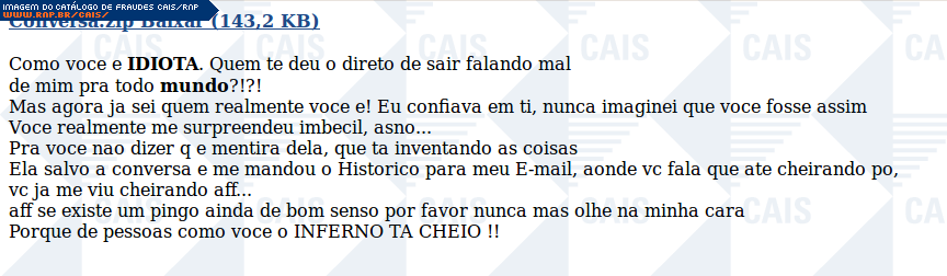 | comentário | Mensagem de suposta conhecida dizendo que a vítima falou mal dela com outra pessoa e, por isso, não quer mais ser sua amiga. A fraude contém em anexo o histórico da suposta conversa. O arquivo malicioso foi identificado como Gen:Trojan.Heur.DP.cmGfaGiZexjG... (leia mais) | |