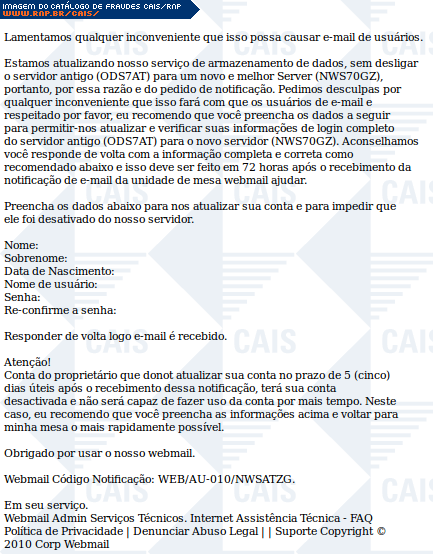 | comentário | A fraude alicia o usuário a responder o email com seus dados pessoais e a senha de seu email. Uma das fraudes mais antigas e simples. Tem como objetivo alvo pessoas leigas com internet e informática. | |
