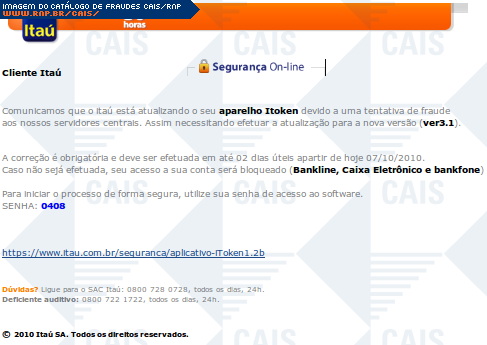 | comentário | Mensagem que se tenta se passar por um comunicado do banco Itaú a respeito de suposta atualização do dispositivo de segurança iToken. A fraude contém um link para download do software de atualização e instruções detalhadas sobre a realização da atualização... (leia mais) | |