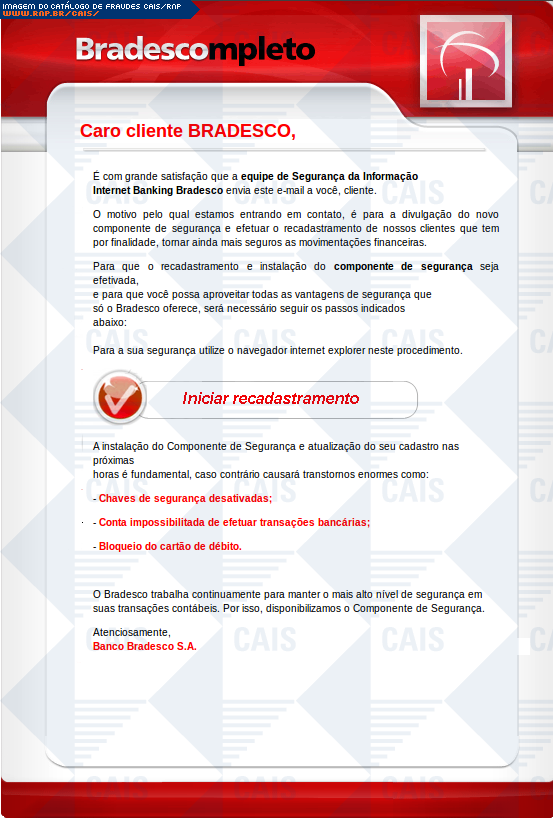 | comentário | Falso email do Banco Bradesco que solicita ao destinatário que seja realizado um recadastramento e instalação do componente de segurança. O link contido na mensagem leva a um site falso destinado a roubar informações confidenciais da vítima. | |