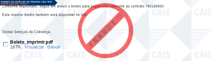 Esta página tem função informativa e educativa. Exibe uma coleção de imagens de phishing scam (fraudes eletrônicas) ou malware (código malicioso) veiculados por meio de spam (e-mail não-solicitado). Trata-se de conteúdo exemplificativo, não exaustivo, uma vez que não é possível contemplar todos os casos de fraudes existentes. Assim, caso você tenha conhecimento de um exemplar que não esteja aqui presente, isto não significa que não seja válido ou real. Inclusive incentivamos que você o envie para análise do CAIS para que, se for o caso, passe a integrar o nosso acervo.