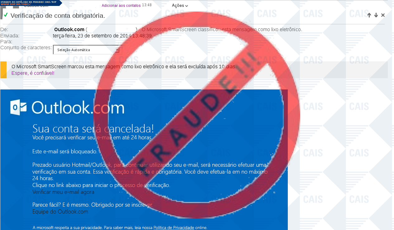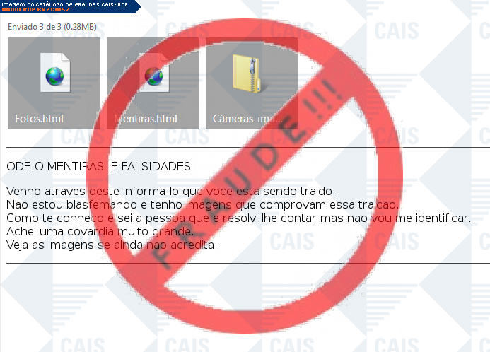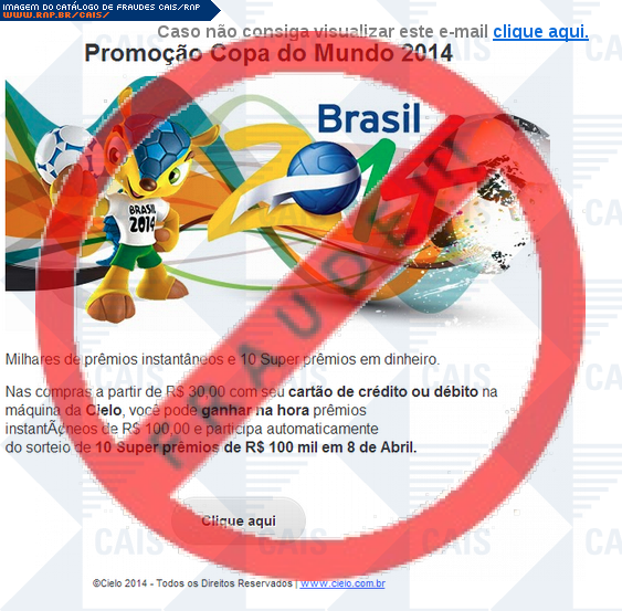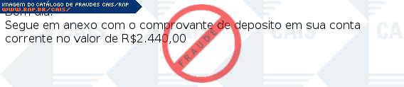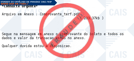 Esta página tem função informativa e educativa. Exibe uma coleção de imagens de phishing scam (fraudes eletrônicas) ou malware (código malicioso) veiculados por meio de spam (e-mail não-solicitado). Trata-se de conteúdo exemplificativo, não exaustivo, uma vez que não é possível contemplar todos os casos de fraudes existentes. Assim, caso você tenha conhecimento de um exemplar que não esteja aqui presente, isto não significa que não seja válido ou real. Inclusive incentivamos que você o envie para análise do CAIS para que, se for o caso, passe a integrar o nosso acervo.