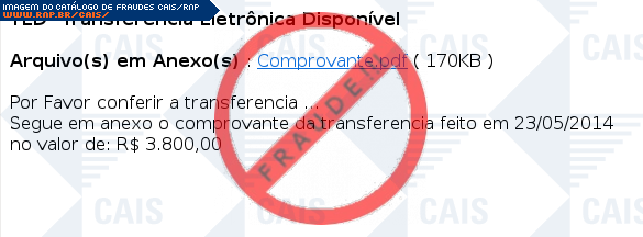 | comentário | O usuário recebe uma mensagem contendo um arquivo de comprovante de pagamento, quando na verdade trata-se de um arquivo malicioso chamado Trojan.Win32.Banload.bSSR | |
