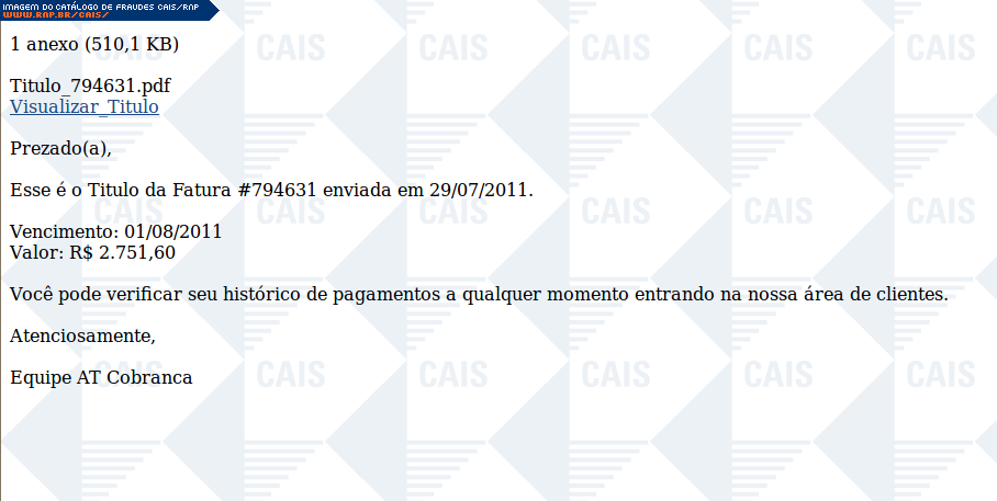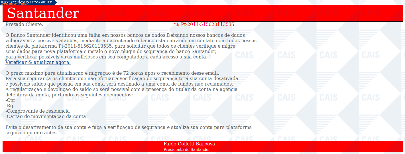 Esta página tem função informativa e educativa. Exibe uma coleção de imagens de phishing scam (fraudes eletrônicas) ou malware (código malicioso) veiculados por meio de spam (e-mail não-solicitado). Trata-se de conteúdo exemplificativo, não exaustivo, uma vez que não é possível contemplar todos os casos de fraudes existentes. Assim, caso você tenha conhecimento de um exemplar que não esteja aqui presente, isto não significa que não seja válido ou real. Inclusive incentivamos que você o envie para análise do CAIS para que, se for o caso, passe a integrar o nosso acervo.