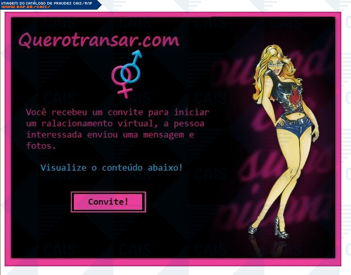 | comentário | A mensagem se passa por um convite para um relacionamento virtual. A fraude contém um link pra a mensagem e foto da pessoa que estaria interessada na vítima. O conteúdo malicioso não estava disponível no momento da análise. | |