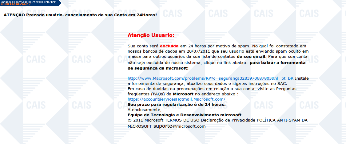 | comentário | A mensagem, em nome da Microsoft, informa que a conta da vítima será cancelada devido ao envio de spams. Para evitar o cancelamento a vítima deve instalar a ferramenta de segurança que foi disponibilizada através de um link. O link leva ao software malicioso... (leia mais) | |