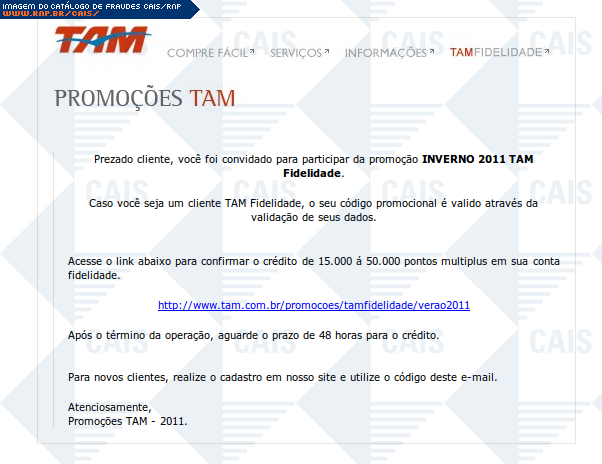 | comentário | A fraude usa o nome da Tam para divulgar uma promoção. O link para o cadastro na suposta promoção leva a conteúdo malicioso que não estava mais disponível no momento da análise. | |