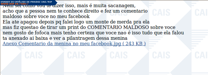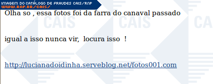 | comentário | A mensgem contém um link para as supostas fotos do carnaval passado. O link leva ao arquivo malicioso que foi identificado como Trojan-Banker.Win32.Banker (Ikarus). | |