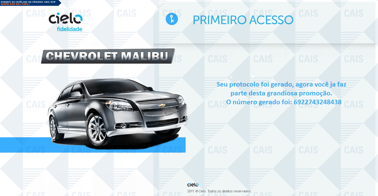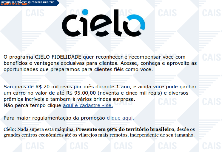 | comentário | Mais uma mensagem que usa o nome da Cielo para tentar aliciar a vítima a se cadastrar em uma promoção falsa. O link contido na mensagem leva a um site falso destinado a coletar dados pessoais da vítima. | |