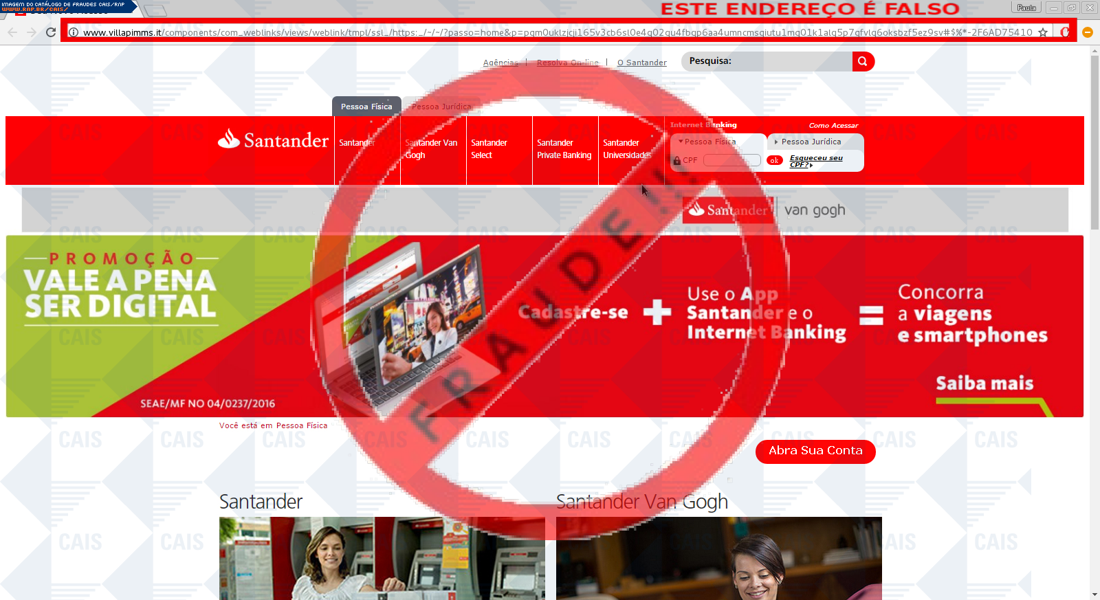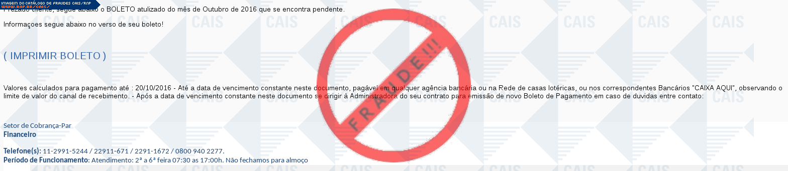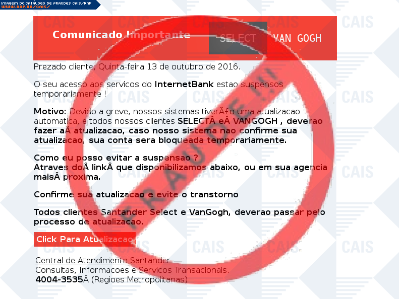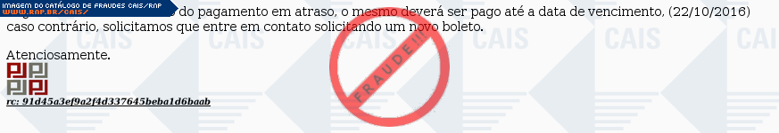Esta página tem função informativa e educativa. Exibe uma coleção de imagens de phishing scam (fraudes eletrônicas) ou malware (código malicioso) veiculados por meio de spam (e-mail não-solicitado). Trata-se de conteúdo exemplificativo, não exaustivo, uma vez que não é possível contemplar todos os casos de fraudes existentes. Assim, caso você tenha conhecimento de um exemplar que não esteja aqui presente, isto não significa que não seja válido ou real. Inclusive incentivamos que você o envie para análise do CAIS para que, se for o caso, passe a integrar o nosso acervo.