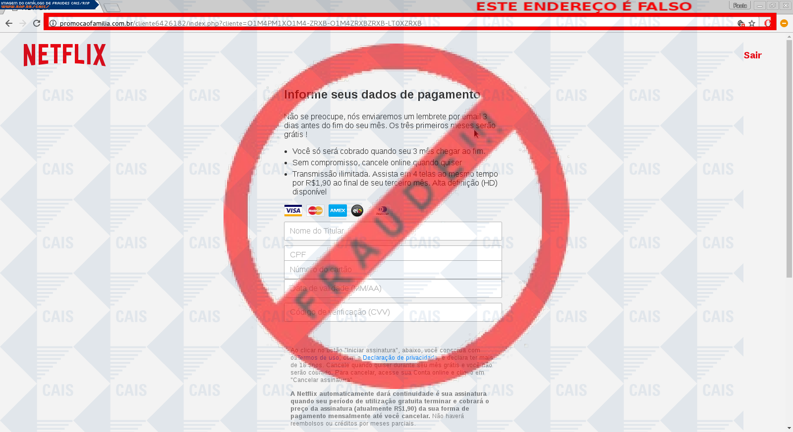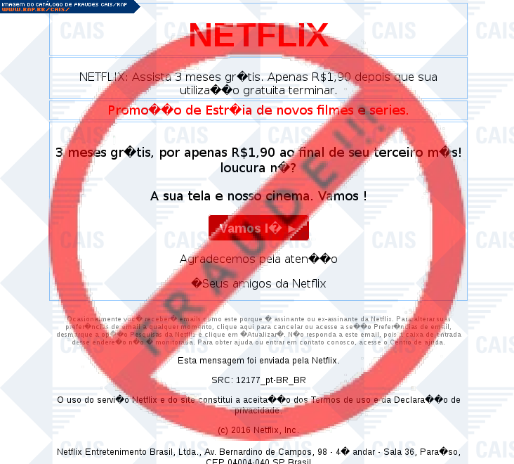 | comentário | A vítima recebe uma mensagem informando sobre promoção de três meses grátis do serviço Netflix no link disponibilizado, no entanto a página é falsa destinada a roubar as informações do usuário. | |