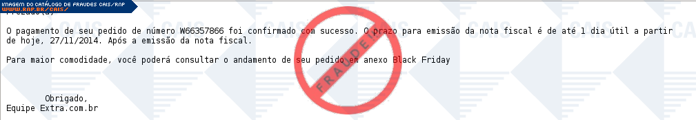 | comentário | O usuário recebe uma mensagem informando que sua compra realizada na Black Friday foi aceita estando maiores informações em um arquivo disponível em anexo, no entanto o arquivo originado é malicioso criado para roubar informações da vítima e instalar outros... (leia mais) | |