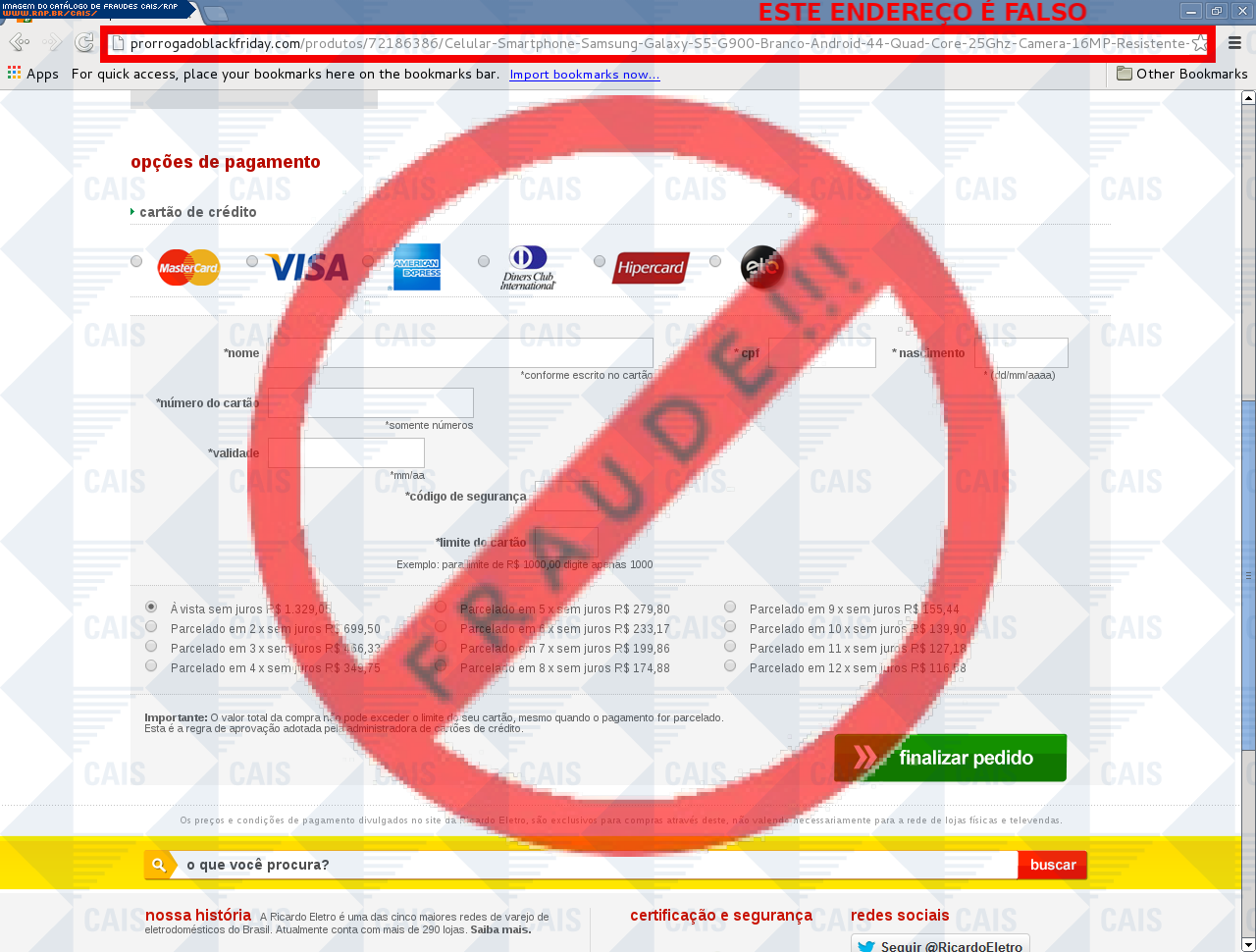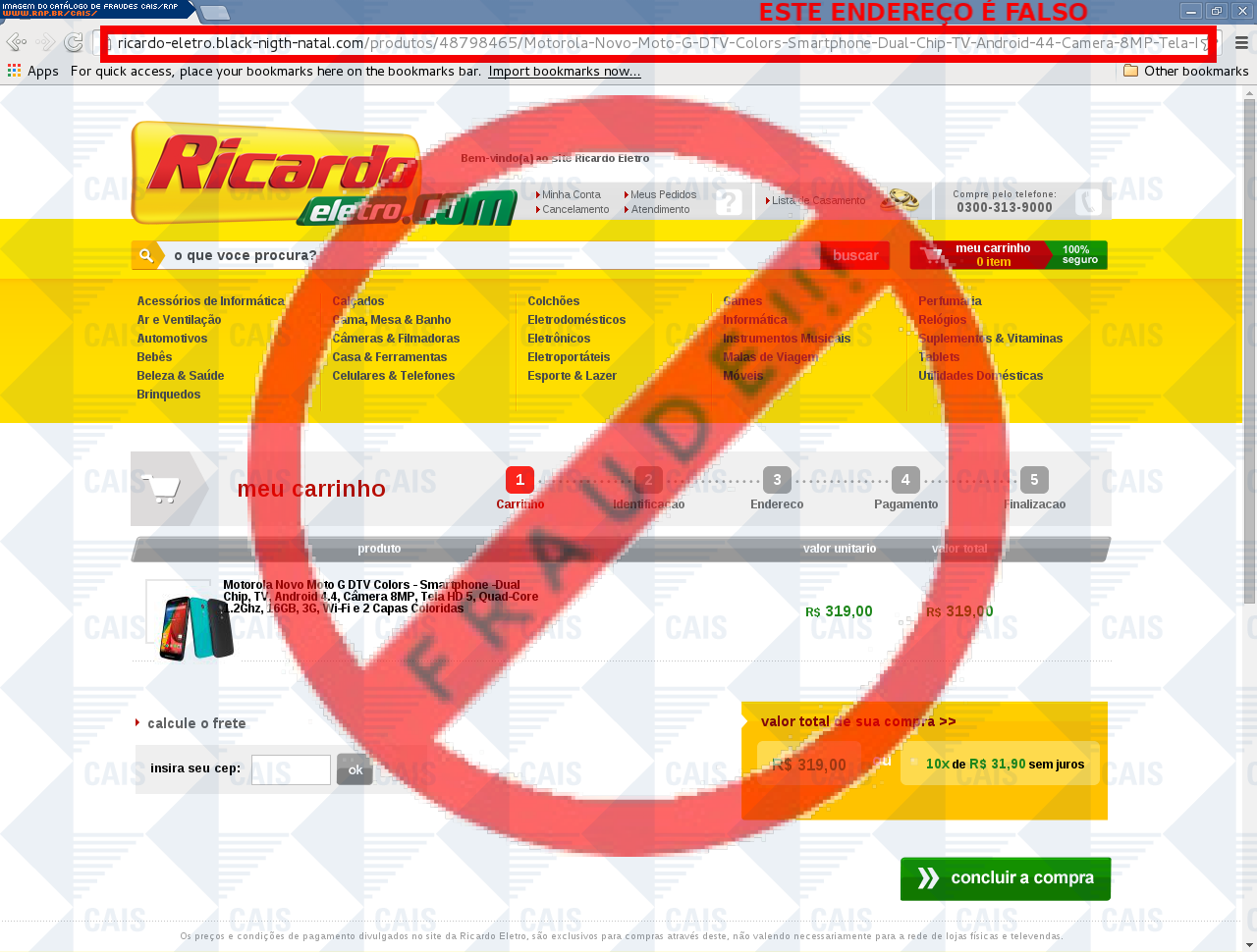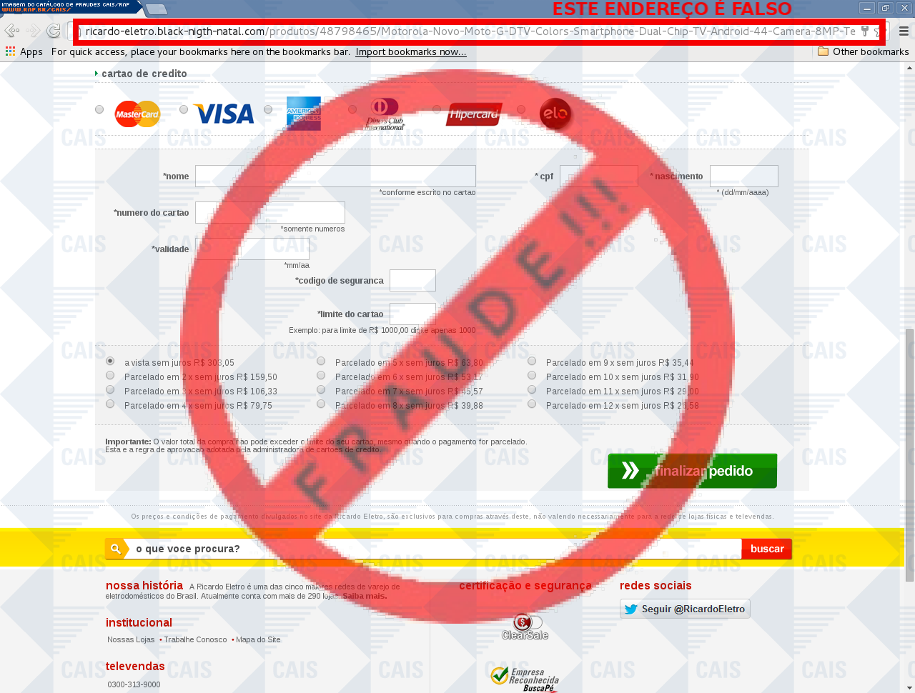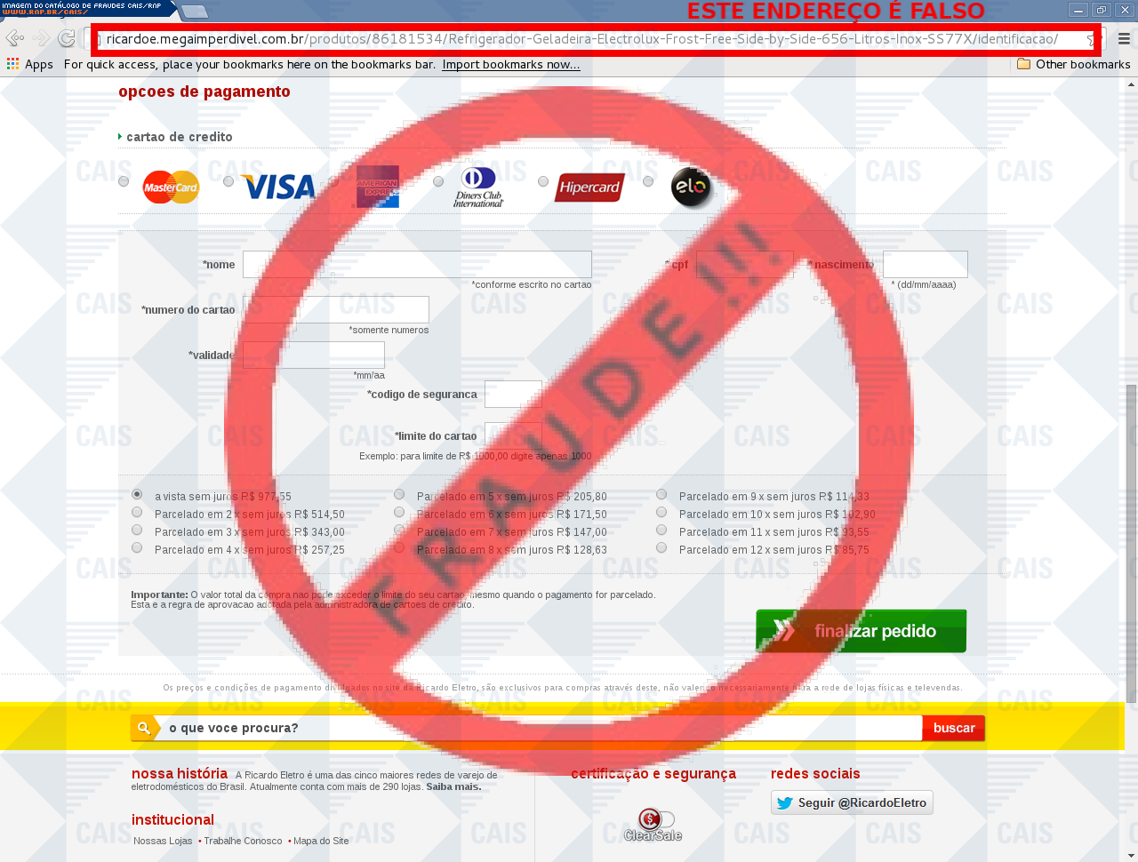 | comentário | A vítima recebe um e-mail informando sobre promoções no site de compra da Ricardo Eletro disponibilizando link de vários produtos em desconto, no entanto a página é falsa destinada a roubar as informações pessoais e do cartão do usuário. | |