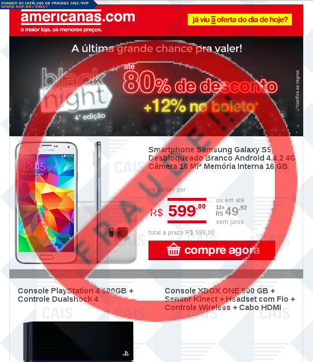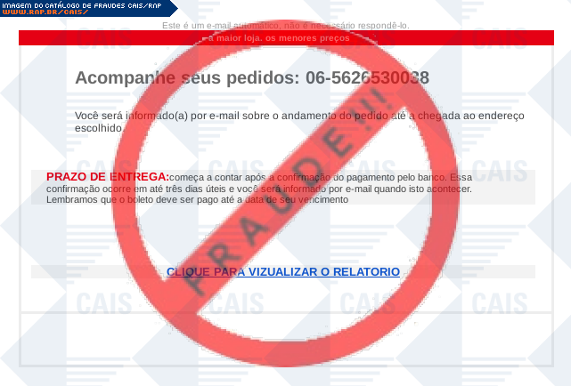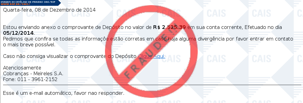 Esta página tem função informativa e educativa. Exibe uma coleção de imagens de phishing scam (fraudes eletrônicas) ou malware (código malicioso) veiculados por meio de spam (e-mail não-solicitado). Trata-se de conteúdo exemplificativo, não exaustivo, uma vez que não é possível contemplar todos os casos de fraudes existentes. Assim, caso você tenha conhecimento de um exemplar que não esteja aqui presente, isto não significa que não seja válido ou real. Inclusive incentivamos que você o envie para análise do CAIS para que, se for o caso, passe a integrar o nosso acervo.