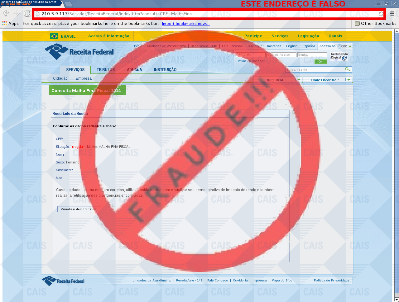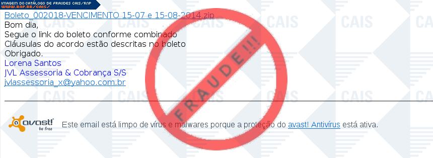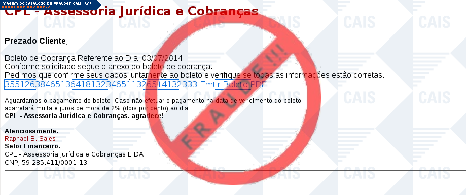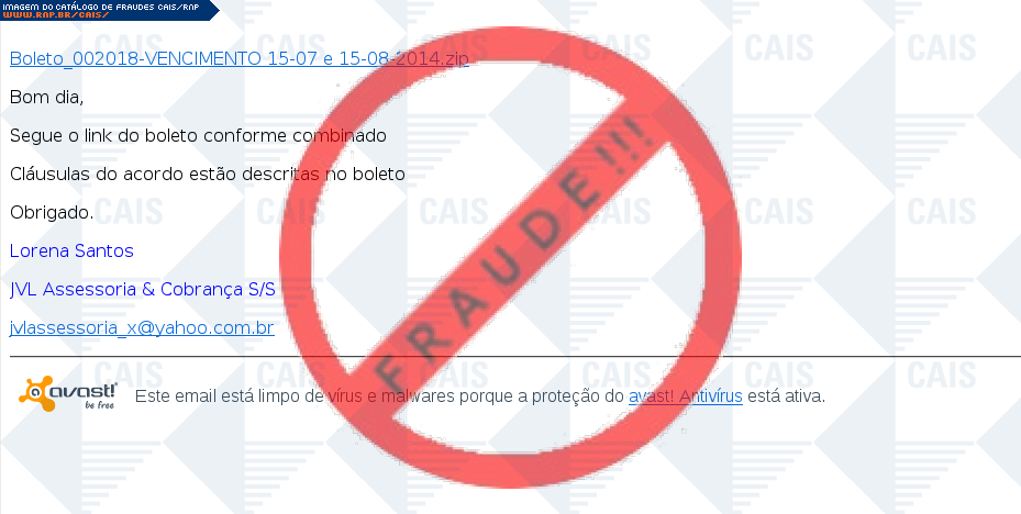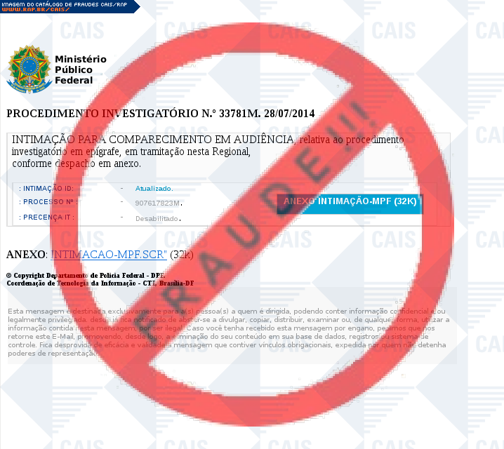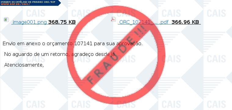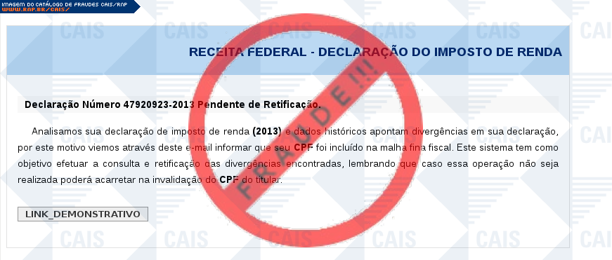 Esta página tem função informativa e educativa. Exibe uma coleção de imagens de phishing scam (fraudes eletrônicas) ou malware (código malicioso) veiculados por meio de spam (e-mail não-solicitado). Trata-se de conteúdo exemplificativo, não exaustivo, uma vez que não é possível contemplar todos os casos de fraudes existentes. Assim, caso você tenha conhecimento de um exemplar que não esteja aqui presente, isto não significa que não seja válido ou real. Inclusive incentivamos que você o envie para análise do CAIS para que, se for o caso, passe a integrar o nosso acervo.