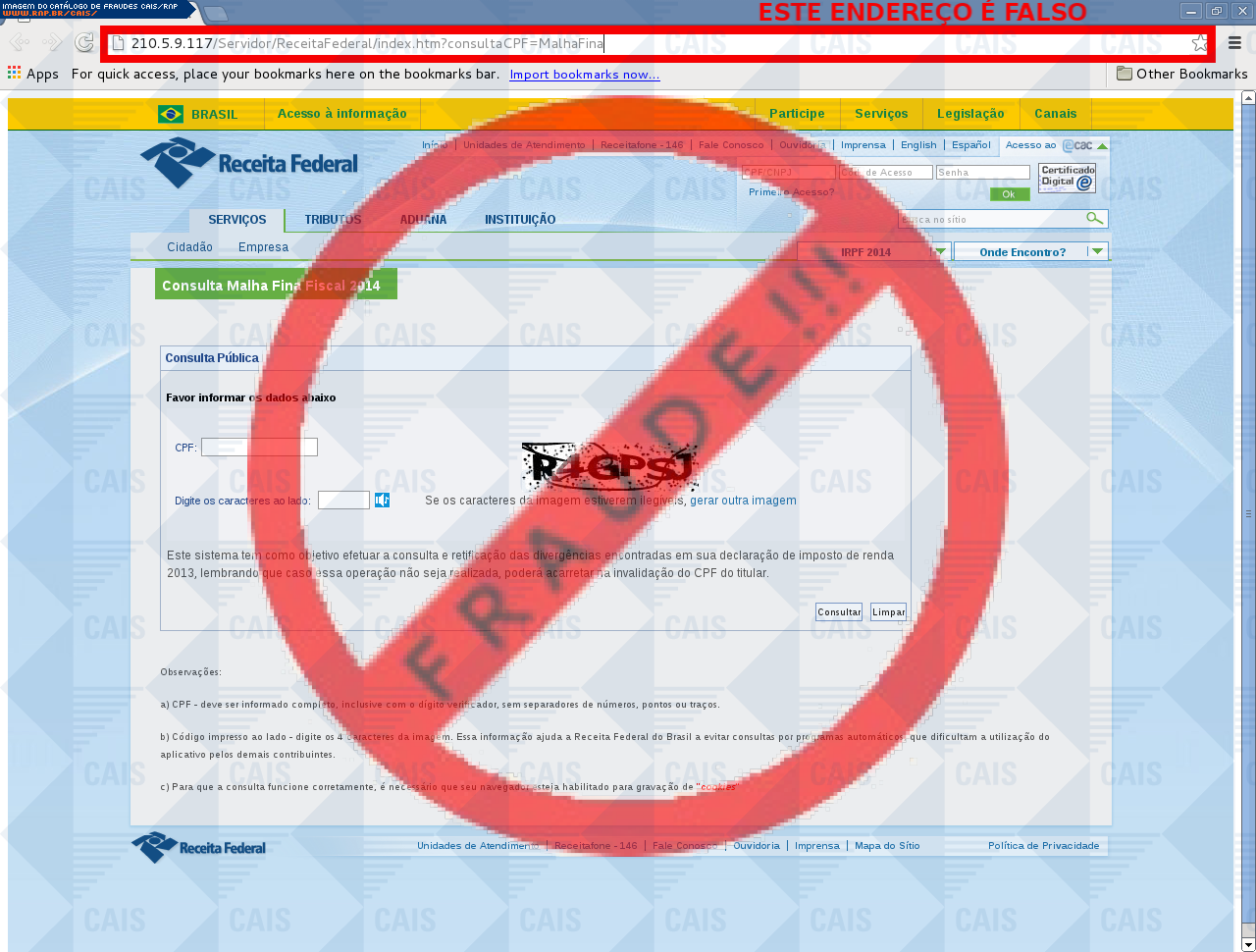 Com a disponibilização pública deste serviço, não é intenção do Centro de Atendimento a Incidentes de Segurança (CAIS) da Rede Nacional de Ensino e Pesquisa (RNP) violar direitos autorais sobre marcas registradas ou logotipos de empresas que porventura constem das amostras. O objetivo é tão somente alertar os usuários sobre as espécies de golpes que se utilizam de tais propriedades intelectuais ou industriais de forma criminosa.