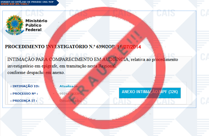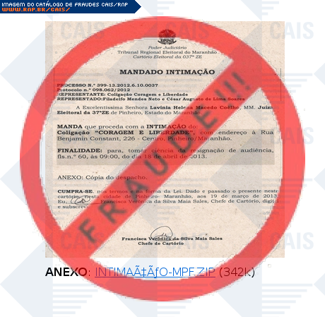 | comentário | A vítima recebe uma mensagem contendo a imagem de um mandado judicial de intimação bem como o link para o download, porém o arquivo gerado é malicioso destinado a roubar informações do usuário com o nome de Trojan.Win32.Generic.ag. | |