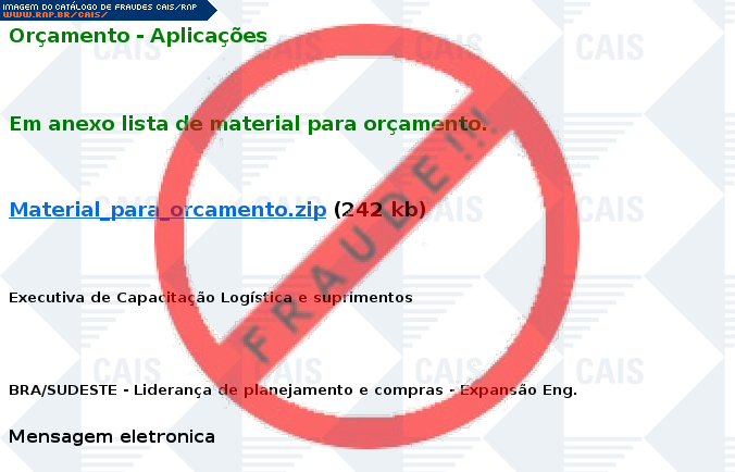 | comentário | O usuário recebe uma mensagem requisitando orçamento de materiais presentes em um documento disponível para download, no entanto o arquivo originado é malicioso destinado a roubar informações da vítima com o nome de Gen:Variant.Symmi.41228. | |