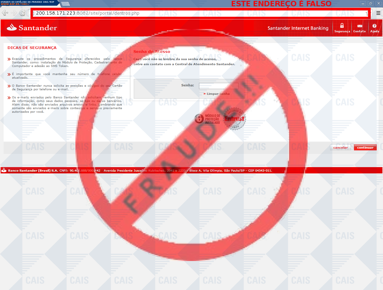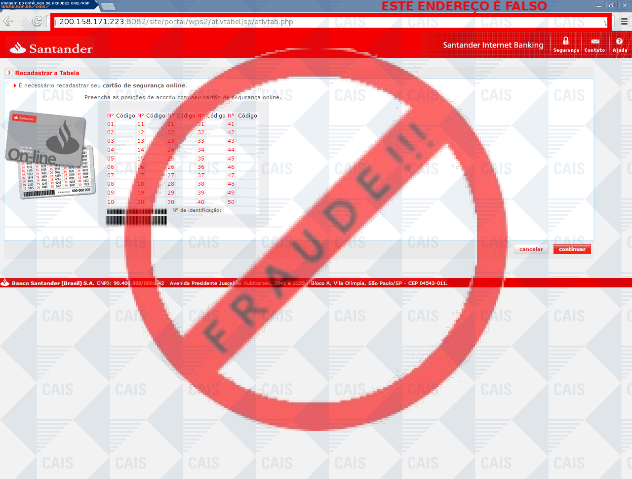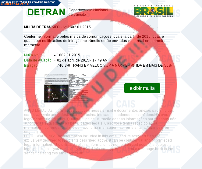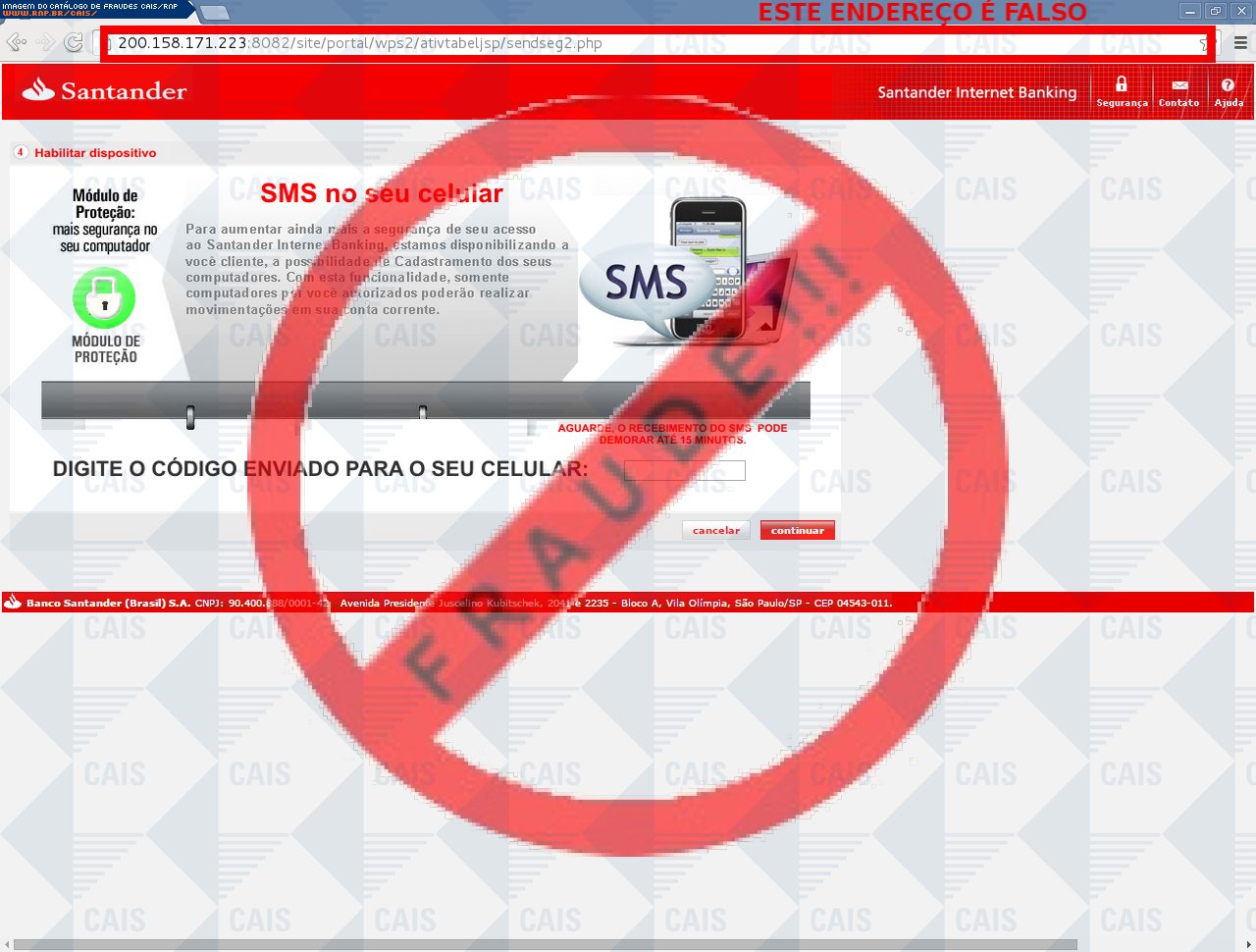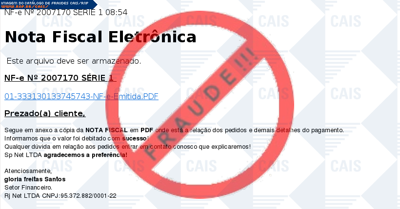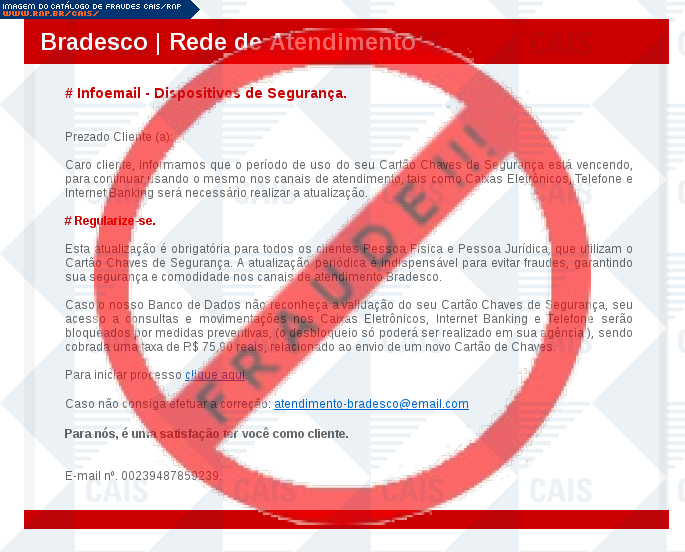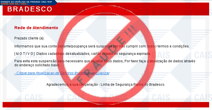Esta página tem função informativa e educativa. Exibe uma coleção de imagens de phishing scam (fraudes eletrônicas) ou malware (código malicioso) veiculados por meio de spam (e-mail não-solicitado). Trata-se de conteúdo exemplificativo, não exaustivo, uma vez que não é possível contemplar todos os casos de fraudes existentes. Assim, caso você tenha conhecimento de um exemplar que não esteja aqui presente, isto não significa que não seja válido ou real. Inclusive incentivamos que você o envie para análise do CAIS para que, se for o caso, passe a integrar o nosso acervo.