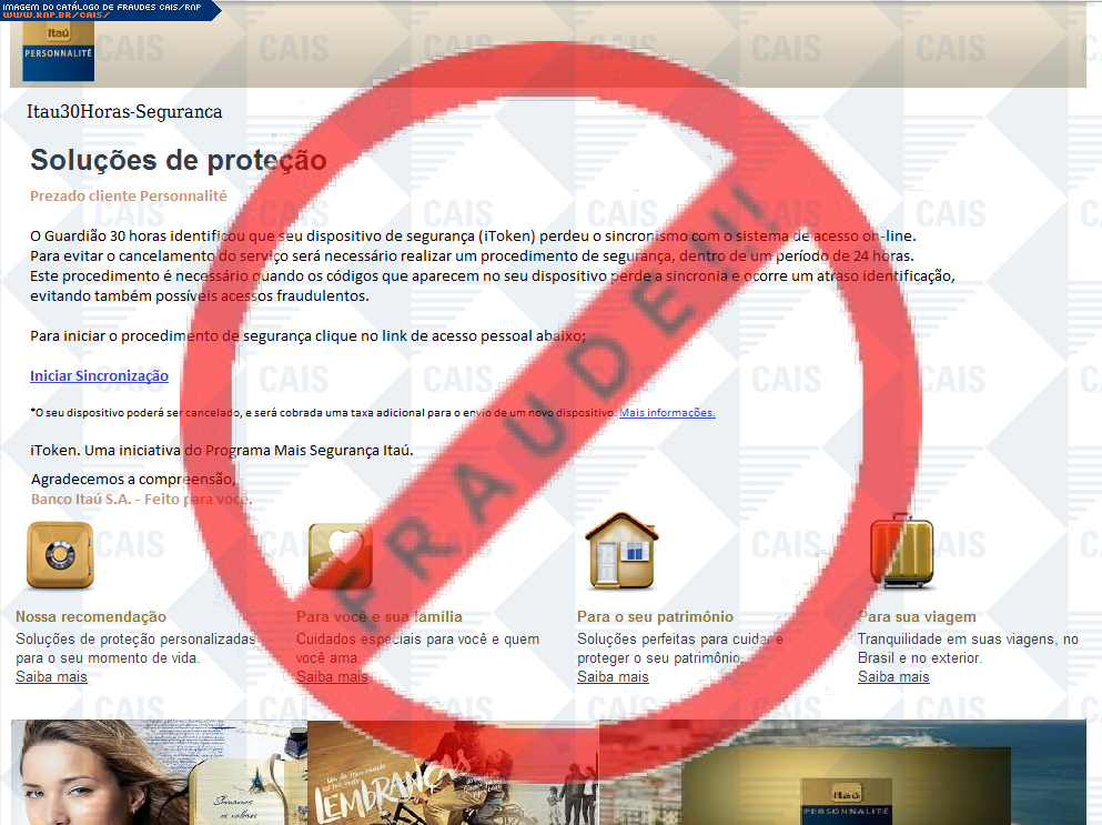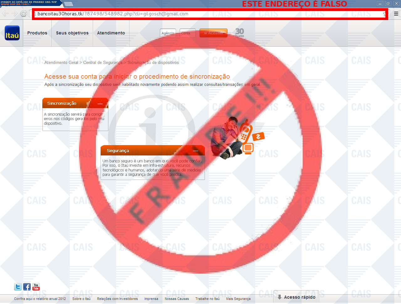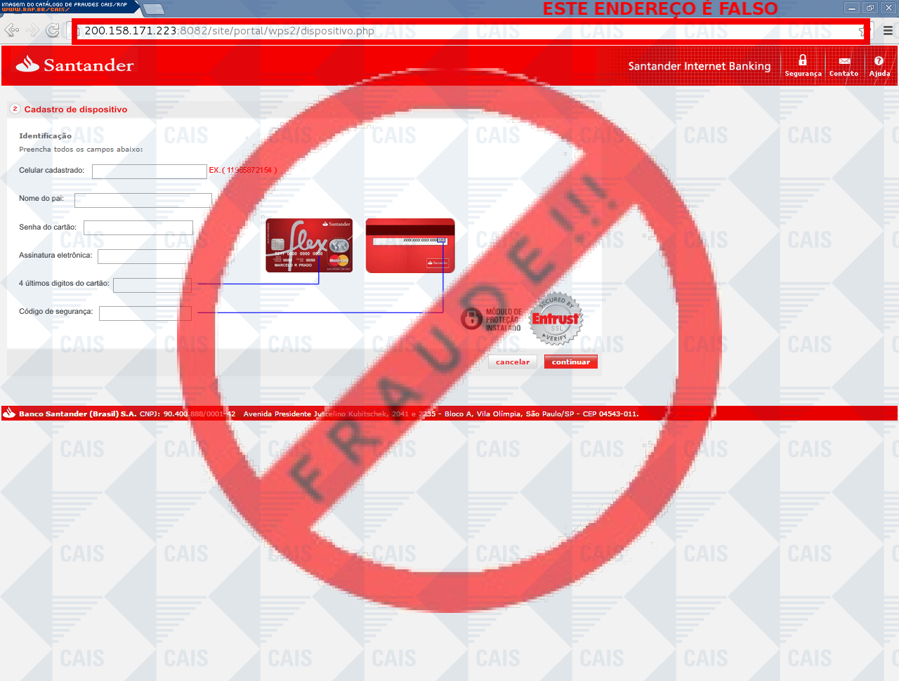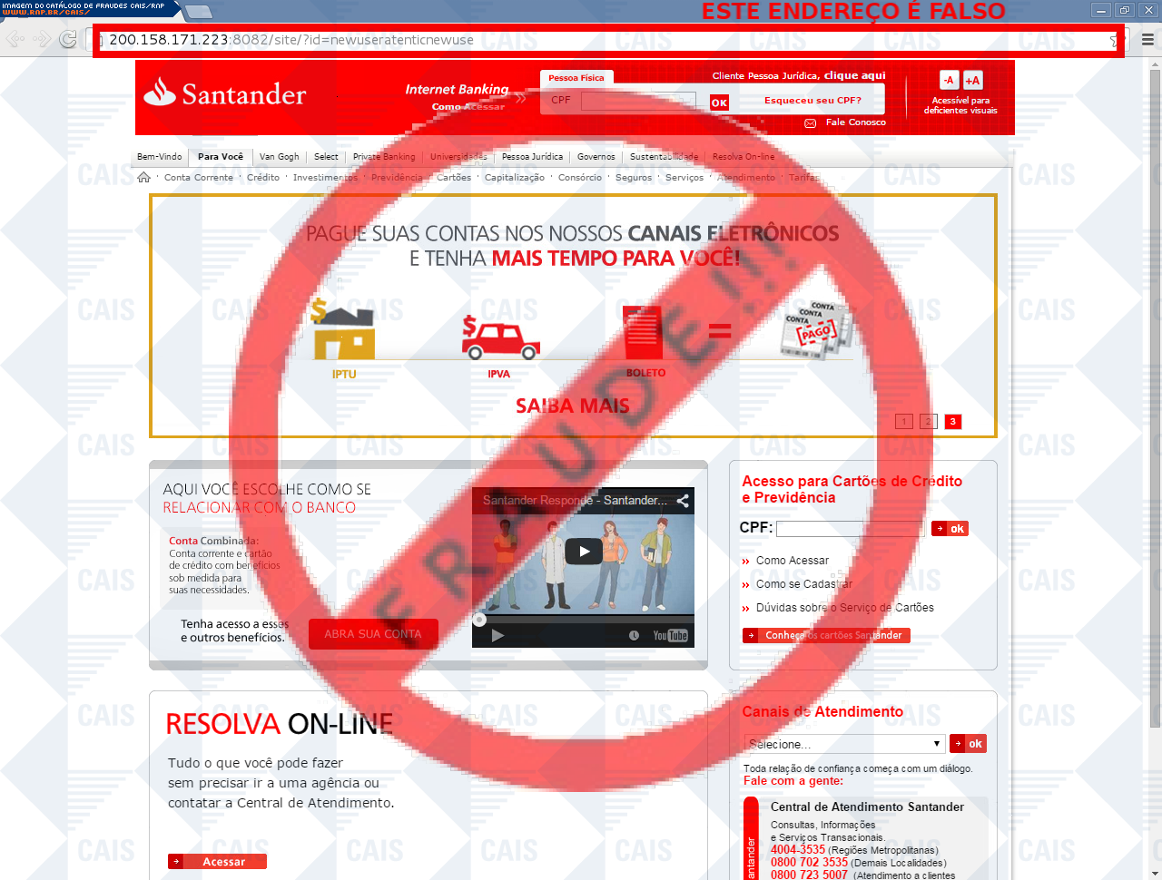 Esta página tem função informativa e educativa. Exibe uma coleção de imagens de phishing scam (fraudes eletrônicas) ou malware (código malicioso) veiculados por meio de spam (e-mail não-solicitado). Trata-se de conteúdo exemplificativo, não exaustivo, uma vez que não é possível contemplar todos os casos de fraudes existentes. Assim, caso você tenha conhecimento de um exemplar que não esteja aqui presente, isto não significa que não seja válido ou real. Inclusive incentivamos que você o envie para análise do CAIS para que, se for o caso, passe a integrar o nosso acervo.