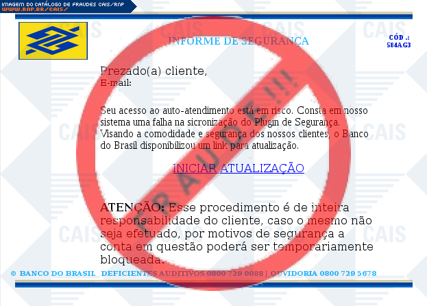 | comentário | O usuário recebe uma mensagem informando que seu auto-atendimento da conta no Banco do Brasil está em risco devido a uma falha de sincronização estando o link para regularização disponível, no entanto a página é falsa destinada a roubar as informações bancárias... (leia mais) | |