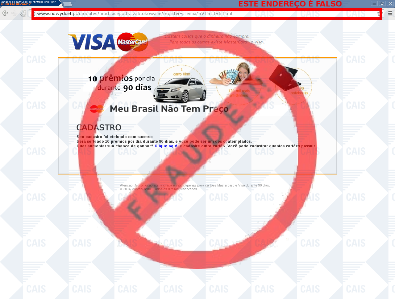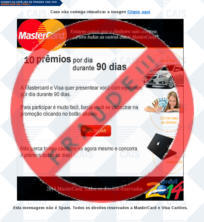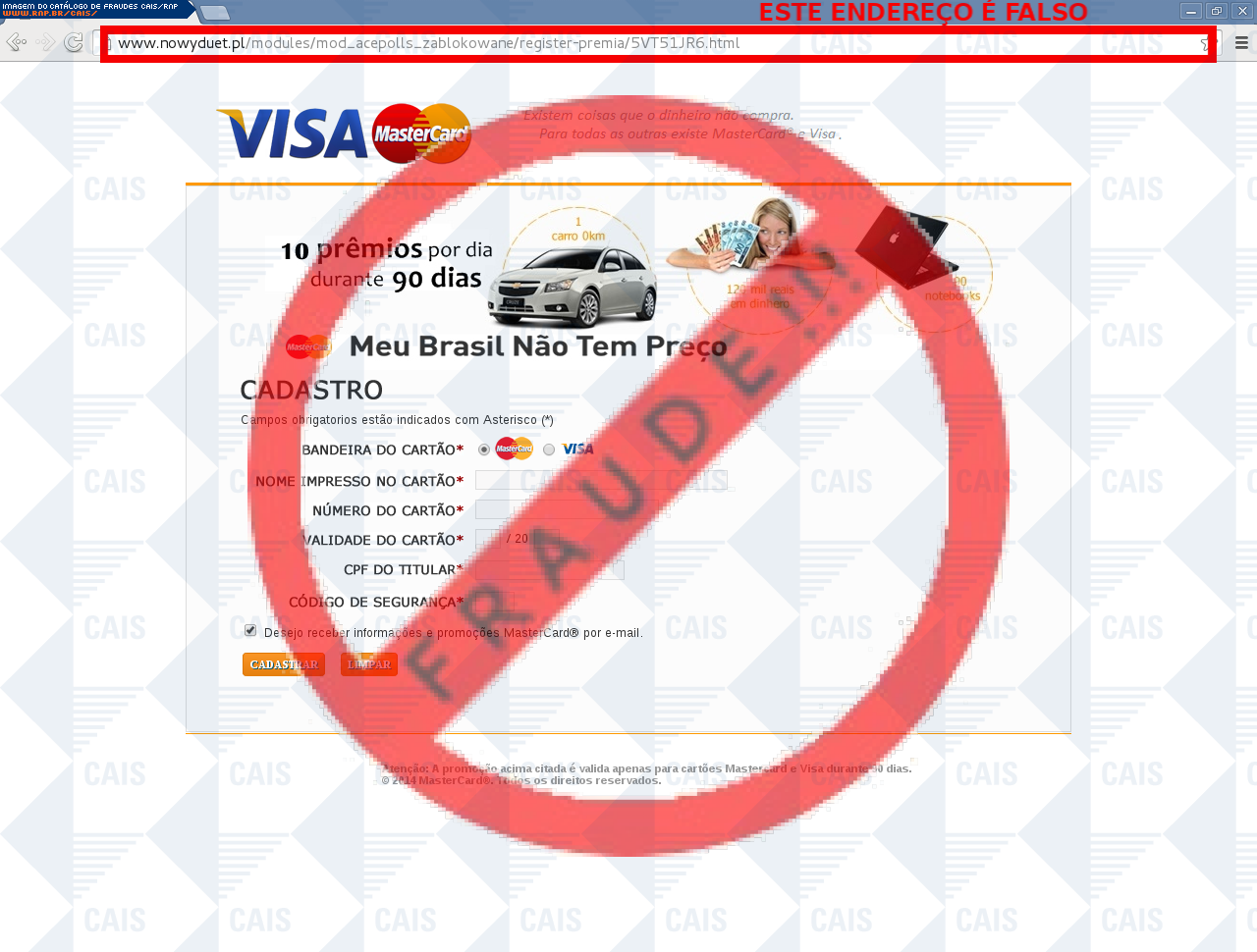 | comentário | A vítima recebe um e-mail informando sobre promoções relacionados a seu cartão MasterCard sendo necessário realizar um cadastro, no entanto a página é falsa destinada a roubar os dados do cartão de crédito do usuário. | |