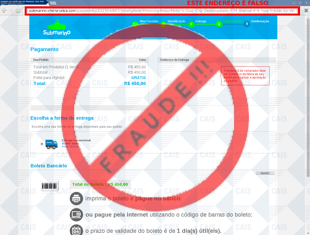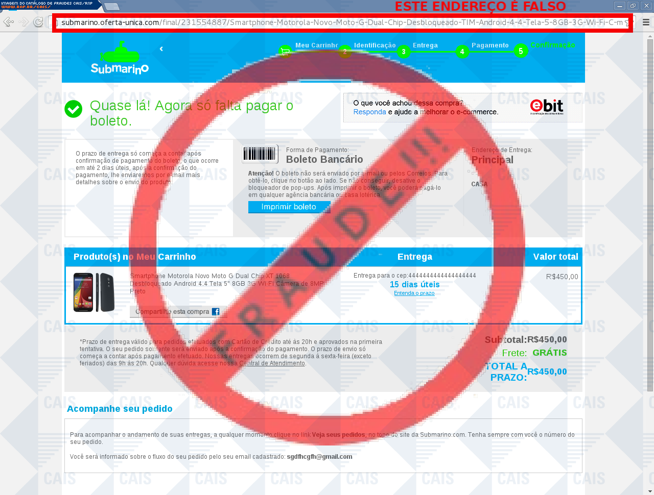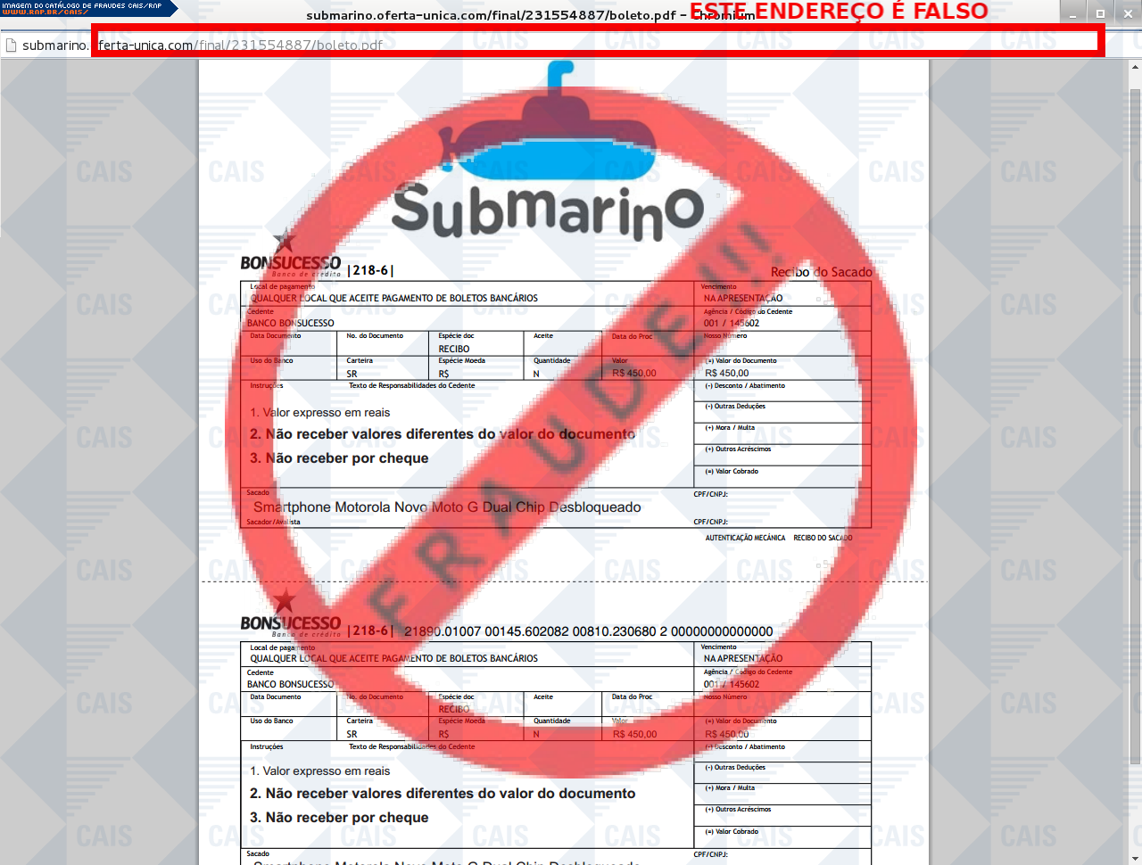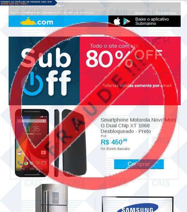 | comentário | A vítima recebe um e-mail informando sobre promoções no site de compra da Submarino disponibilizando link de vários produtos em desconto, no entanto a página é falsa destinada a roubar as informações pessoais e gera um boleto falso para roubar dinheiro da... (leia mais) | |