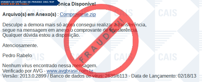 | comentário | Malware: Nessa ocorrencia o usuario recebe um e-mail contendo um suposto comprovante de transferencia, mas ao acessar o link é feito o download de um malware. | |