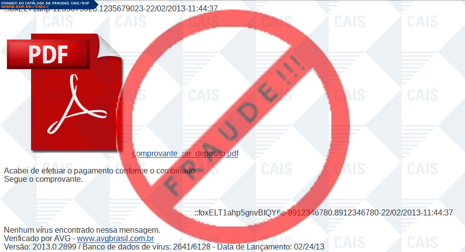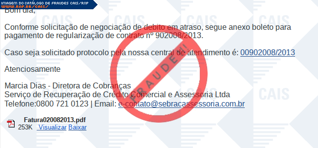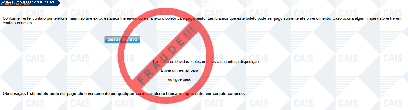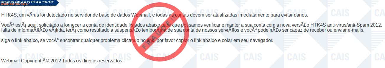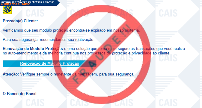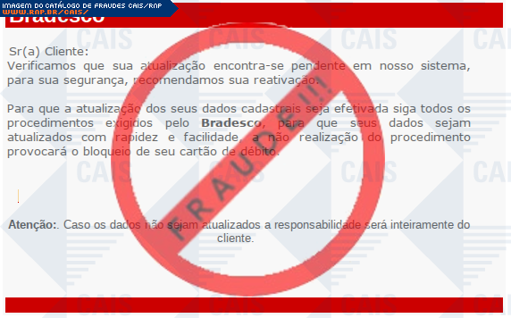 Esta página tem função informativa e educativa. Exibe uma coleção de imagens de phishing scam (fraudes eletrônicas) ou malware (código malicioso) veiculados por meio de spam (e-mail não-solicitado). Trata-se de conteúdo exemplificativo, não exaustivo, uma vez que não é possível contemplar todos os casos de fraudes existentes. Assim, caso você tenha conhecimento de um exemplar que não esteja aqui presente, isto não significa que não seja válido ou real. Inclusive incentivamos que você o envie para análise do CAIS para que, se for o caso, passe a integrar o nosso acervo.
