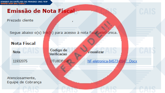 | comentário | Malware: O fraudador encaminha um email ao usuario contendo uma suposta nota fiscal de um serviço prestado, mas ao acessar o link é feito o download de um malware. | |