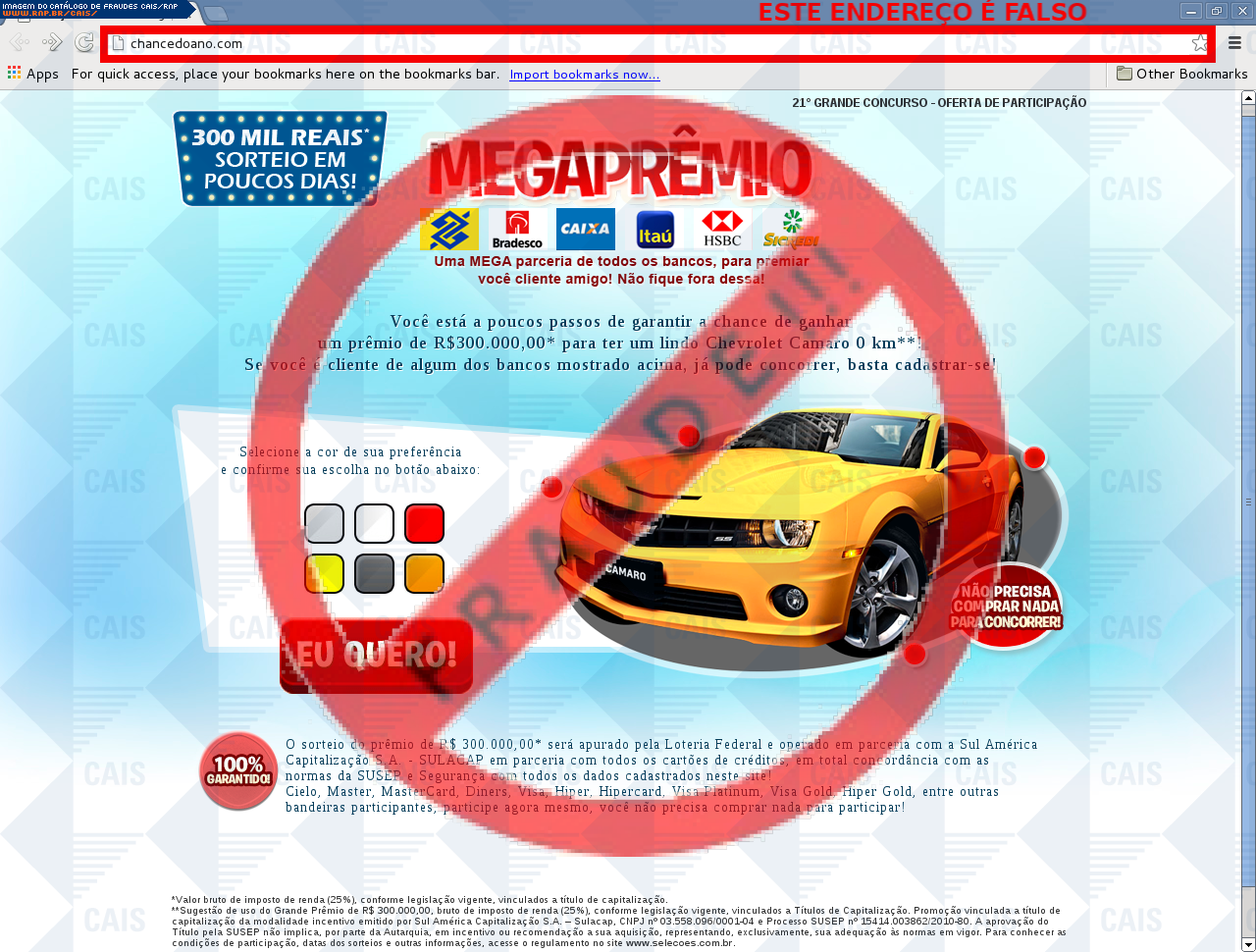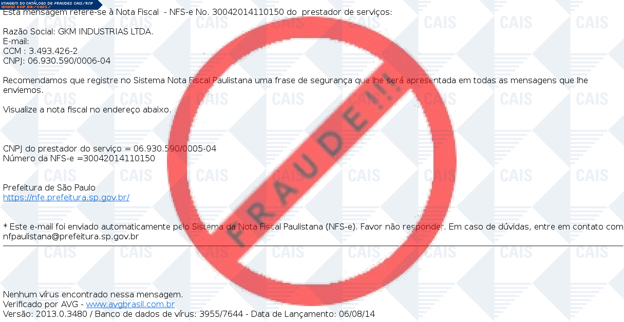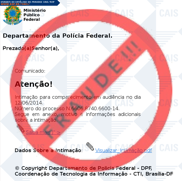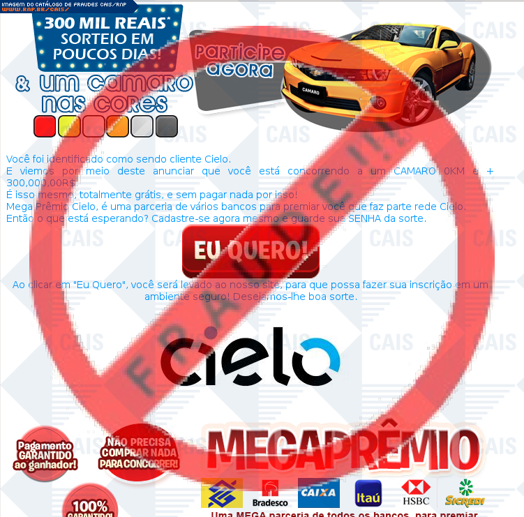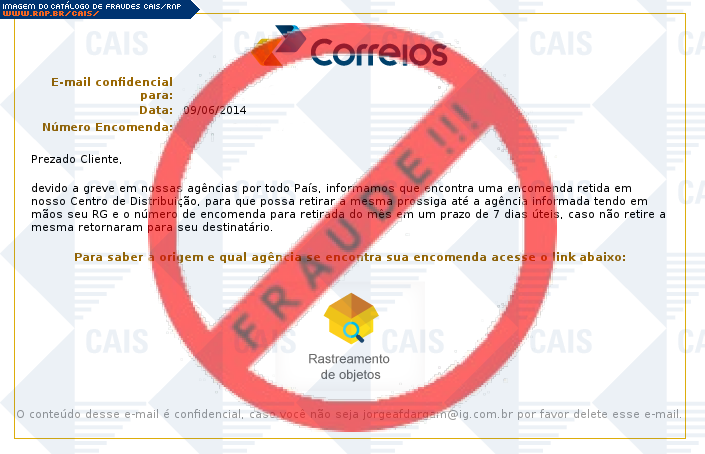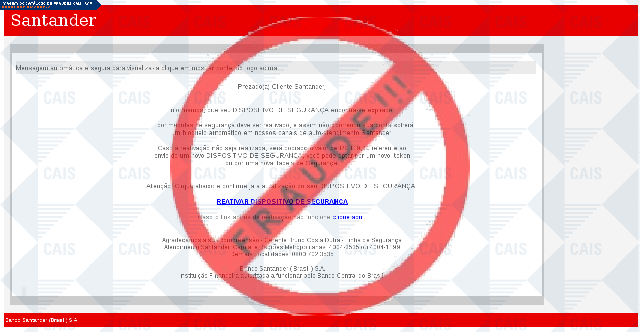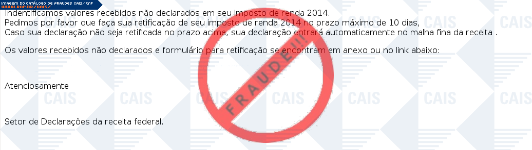 Esta página tem função informativa e educativa. Exibe uma coleção de imagens de phishing scam (fraudes eletrônicas) ou malware (código malicioso) veiculados por meio de spam (e-mail não-solicitado). Trata-se de conteúdo exemplificativo, não exaustivo, uma vez que não é possível contemplar todos os casos de fraudes existentes. Assim, caso você tenha conhecimento de um exemplar que não esteja aqui presente, isto não significa que não seja válido ou real. Inclusive incentivamos que você o envie para análise do CAIS para que, se for o caso, passe a integrar o nosso acervo.